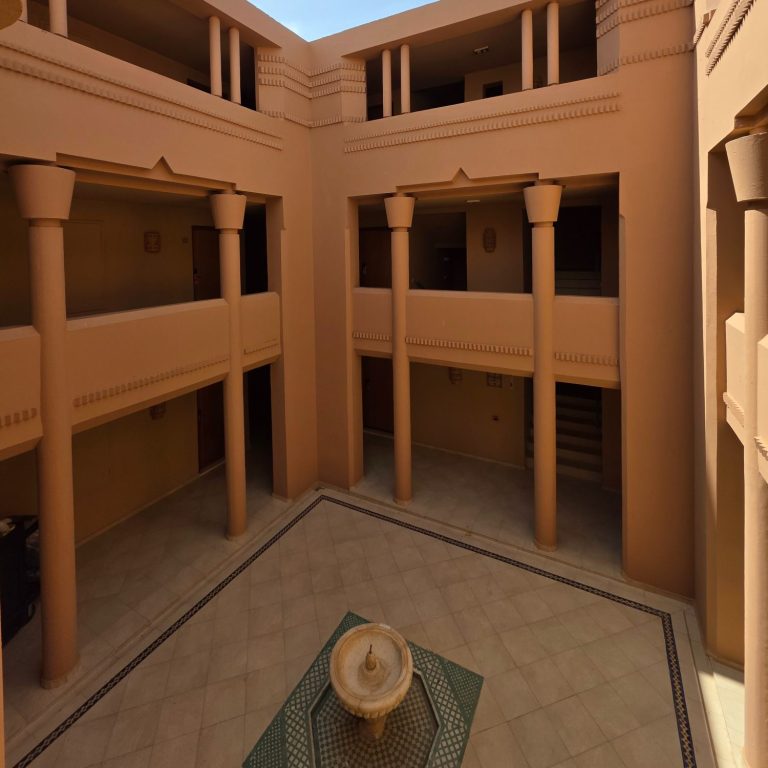The resort was in the traditional Moroccan style, with the accommodation split among multiple ‘Riad’s’ (Traditional house) with a large bright marble courtyard and the centre of each. My room was in Riad Saffran. As with traditional Moroccan architecture, the outside of the buildings look plain and unassuming, while the interiors are considerably more opulent and ornate. The Riad’s are surrounded with bright, fragrant, flower lined garden walkways and date palm trees.