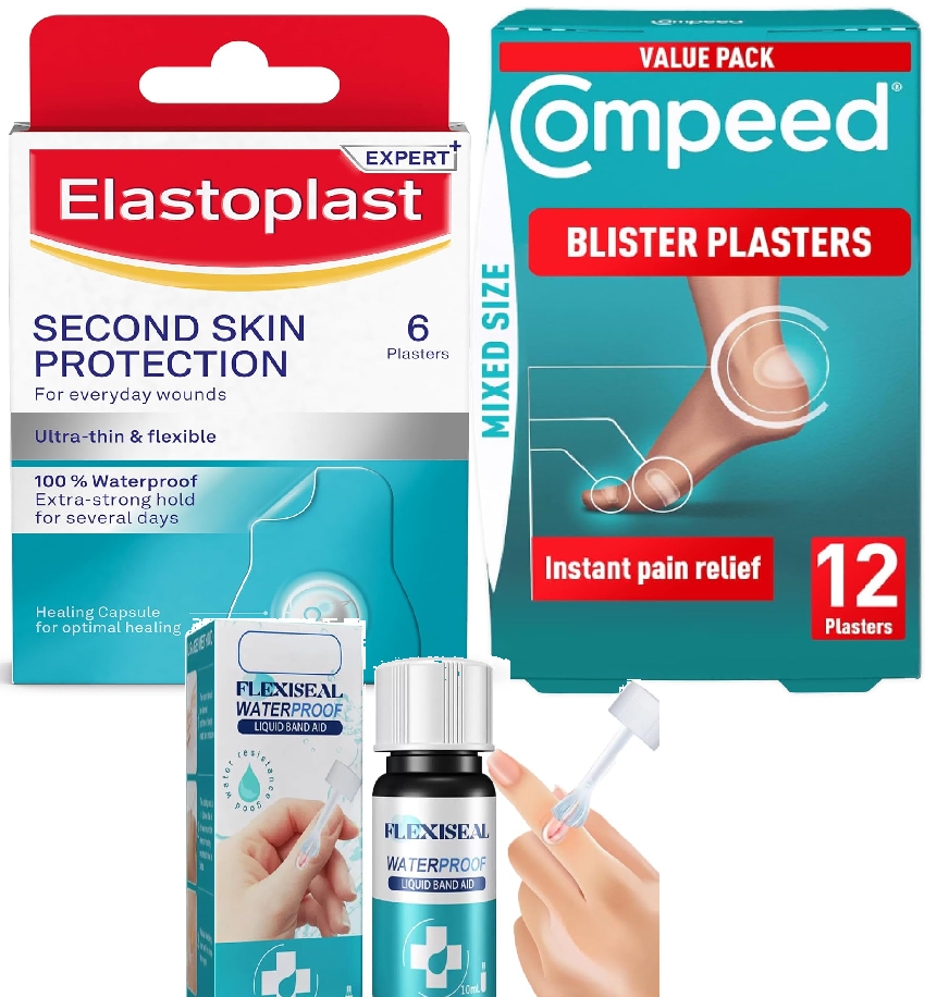 Plasters: We recommend the Elastoplast 'Second Skin' plasters, as these plasters tend to get a better seal on the skin, and are less prone to moving/getting rubbed off by clothing, as well as providing better protection for the wound in warm/humid climates.